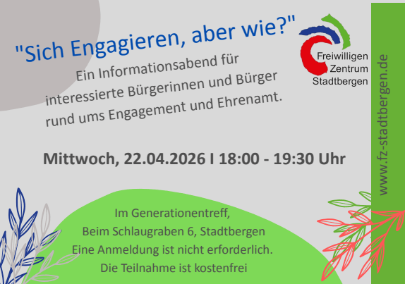 - Veranstaltung „Sich engagieren – aber wie“ am 22. April 2026 – Interessierte Bürger:innen erhalten erste Impulse für ein Engagement. Beginn ist um 18:00 Uhr im Generationentreff, Beim Schlaugraben. Eine Anmeldung ist nicht notwendig.